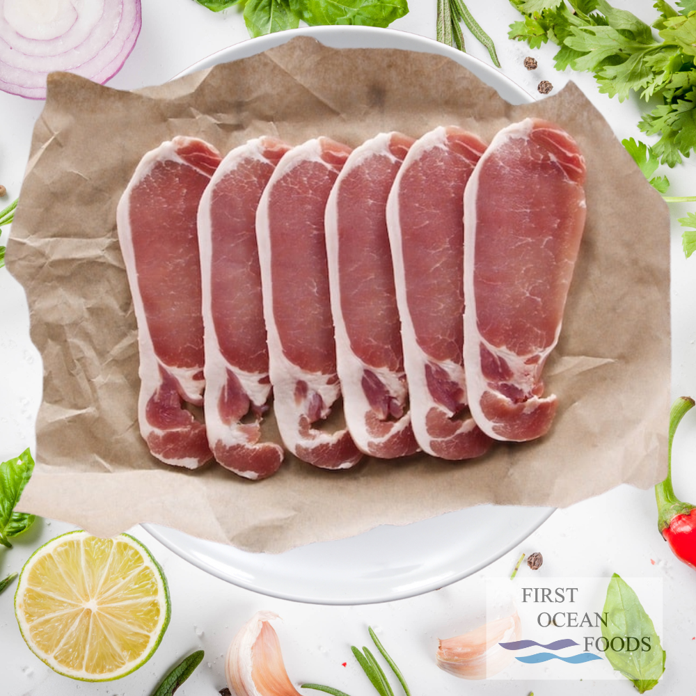 Our Back bacon, also known as Canadian bacon, is a type of bacon that is typically made from the leaner portion of the pig, specifically the back loin. Unlike traditional streaky bacon, which comes from the belly, back bacon is much leaner and has a distinctive shape, often resembling a pork chop. It is usually cured and then either smoked or unsmoked, giving it a mild flavor and a tender texture. Back bacon can be enjoyed in various ways, including grilled, pan-fried, or used as a topping for dishes like sandwiches, salads, or breakfast plates. Its unique, slightly sweet and smoky taste makes it a favorite among bacon lovers who prefer a leaner alternative to traditional bacon.